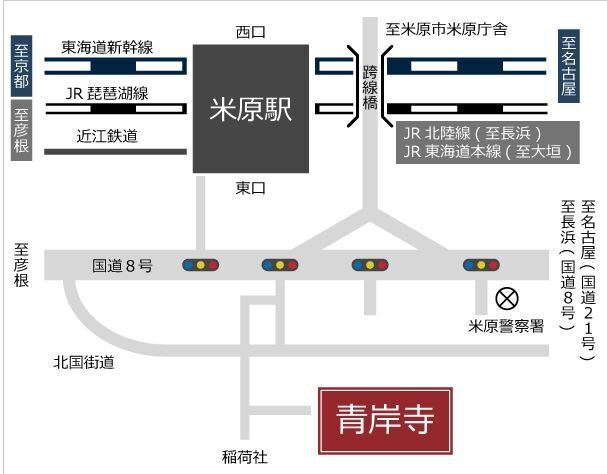 青岸寺がある滋賀県米原市は、滋賀県唯一の新幹線停車駅を有するほか、JR東海・西日本、近江鉄道が乗り入れし、また、名神高速道路・北陸自動車道ICも立地する、近畿エリアにおける広域交通の要衝でアクセスは抜群です。