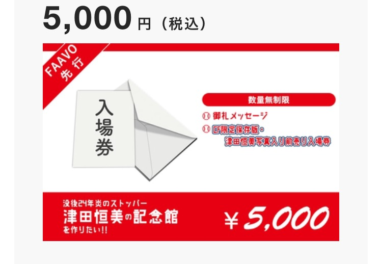 こんにちは津田大毅です。 今回は支援できるコースについてまとめました。 -個人コース- ・入場券コース 「記念館に訪れてはみたい」といった方向けのミニマムプランとなります。ご来場お待ちしております。 ・サインボールレプリカコース 津田恒美のサインを印刷したボールをお送り致します! サインボールは「津田恒美」ではなく背番号14の「津田恒実」のものを採用しております。 ・よろずや『バイバイ』DVDコース 父の生涯を舞台化して上演している演劇集団よろずやさんからのご厚意でDVDのプランを設定いたします。ぜひご来館の前に舞台をご覧ください! ・限定前売り入場券コース WEBへのご氏名掲載はありませんが、チケットとサインボールレプリカのセットのコースをご用意しました。サインボールは「津田恒美」ではなく背番号14の「津田恒実」のものを採用しております。 ・復刻版ユニフォームコース 復刻版ユニフォームは黄金期と言われた1977年~1989年に使用していたユニフォームです。記念館が設立できた際には販売する予定ですが、募金を頂いた方には先行的にお配り致します。サイズはS・M・L・Oをご用意しており、色は白(ホーム)と青(ビジター)がございます。※備考欄にユニフォームのサイズと色を必ずご記入頂きますようお願いいたします。 ・津田恒美イラスト集、セレモニー参加コース 色んな漫画家さんが描いた津田恒美を1つの冊子にしてお送りいたします。 関係者限定の除幕式招待券をお送りいたします。(日程内容については決まり次第ご連絡致します。) ・完全復刻版ユニフォームコース(ホーム) 「完全復刻版」のユニフォーム再現を行うことといたしました!レプリカは着用用、完全復刻版は保管用として置いていただけるとうれしいです。サイズはS・M・L・Oをご用意しております。※備考欄にユニフォームのサイズと色を必ずご記入頂きますようお願いいたします。※ユニフォームのサイズは統一させていただきます。 ・完全復刻版ユニフォームコース(ビジター) 「完全復刻版」のユニフォーム再現を行うことといたしました!レプリカは着用用、完全復刻版は保管用として置いていただけるとうれしいです。サイズはS・M・L・Oをご用意しております。※備考欄にユニフォームのサイズと色を必ずご記入頂きますようお願いいたします。※ユニフォームのサイズは統一させていただきます。 ・年間フリーパスコース 限定年間フリーパスが付いたコースです! また、復刻版ユニフォームのセットやセレモニー参加券、協力漫画家さんのイラスト集もお送り致します! -法人コース- ・社名刻印プレート(小) ・社名刻印プレート(中) ・商品のサンプリングorプレイスメント権 以上が今現在でご支援いただけるコースとなります。 また、本日中に最後の追加コースを発表致しますのでご確認いただければ幸いです! 残り7日となりましたが、今後ともご支援ご協力の程宜しくお願い申し上げます。