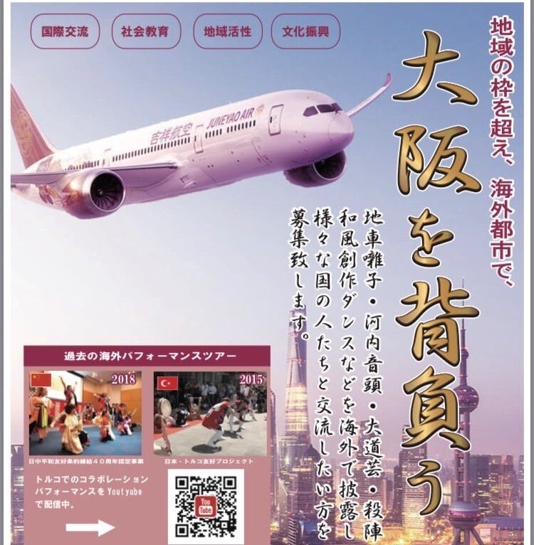 様々な国でダンス/大道芸/伝統芸能などのパフォーマンスを行い、八尾の素晴らしさを海外の方に広めていきます