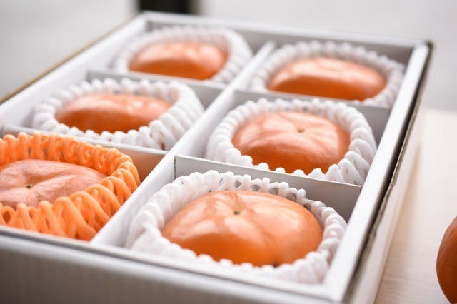 2年前には、ひらたねなし柿をどうすればもっと買ってもらえるか、どうすれば柿農家を次の代に受け継げるか、伊吹果樹組合のみんなで何度も何度も話し合い、「樹上脱渋」という製法による手作りの最高級ブランド柿・“霊峰”を生み出し、6個入り200セットの生産にこぎ着けました。