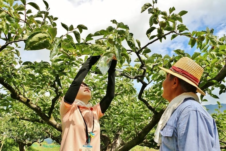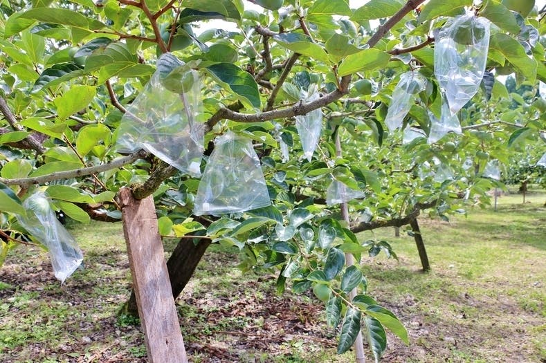 ▲樹上脱渋の袋掛け。京都大学杉浦教授が編み出した画期的な手法です。