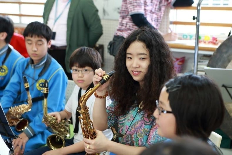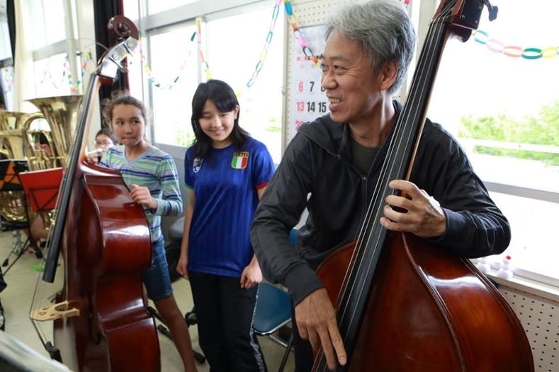 プロのジャズミュージシャンとコラボレーションしているのは、宮崎の小学生、中学生の子どもたちです。