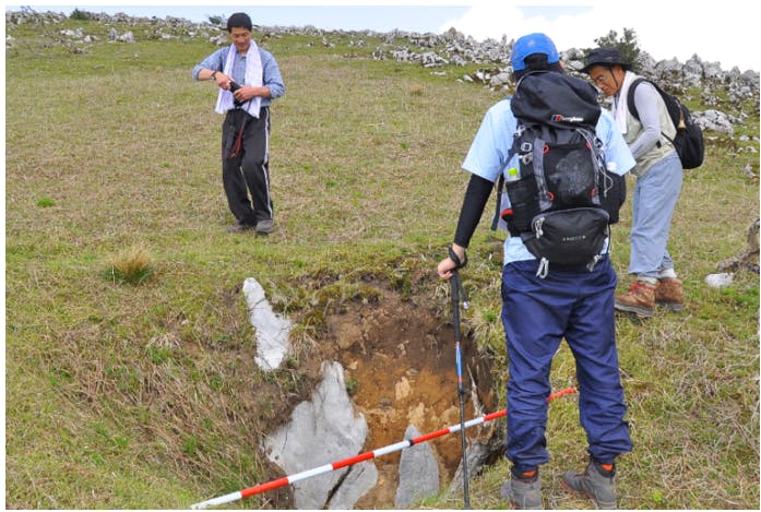 今は、植物がなくなった表面の土が年々雨で流され、石灰岩がむき出しのカルスト大地となり、ドリーネと呼ばれるすり鉢状の危険な穴が至る所に出来ています。