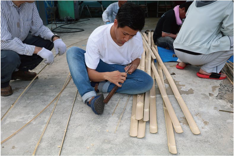 ▲地域の有志達による竹ひご製作の様子です。(写真右手が大淵の竹細工職人)