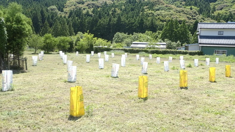 苗木に袋をかけることで背の低いウサギは新芽を食べることができない,,はず!