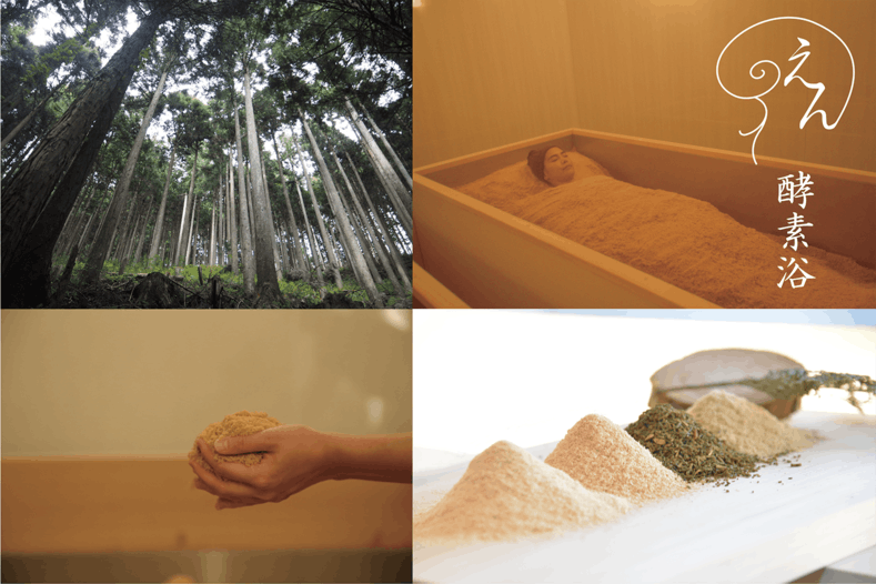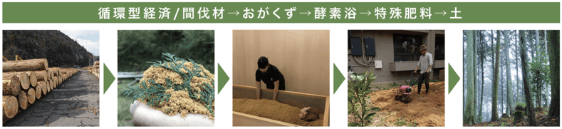 不純物の混ざらない天然無垢の吉野ヒノキのみ使用、端材や間伐材を特殊パウダー状に加工、酵素浴使用後は堆肥として利用する循環型経済を実現