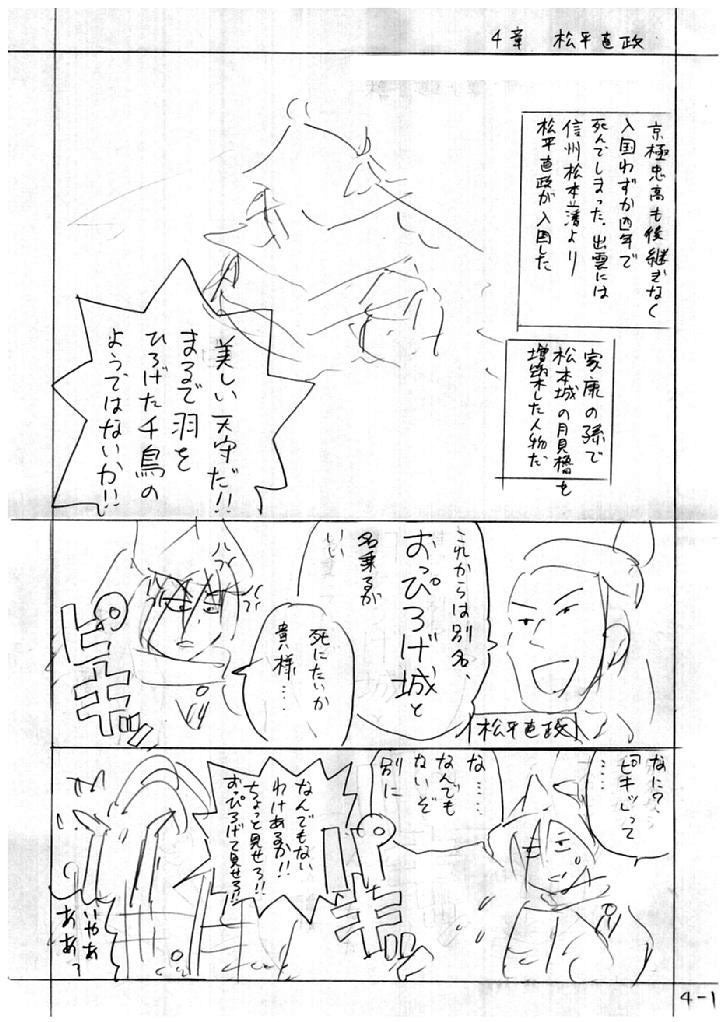 最大で全4話になる話のうち、吉晴・忠氏・忠治の堀尾三代による松江城築城話をネームにせり。レポートで読めるのでご覧あれ。