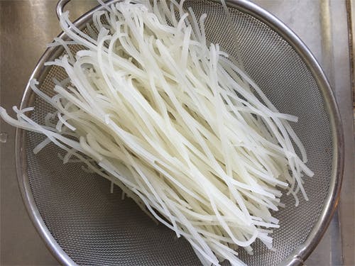 くののめんに使われているお米はもちろん久野産。麺加工に適した品種で、一般的な食用米よりアミロース(でんぷんの一種)を多く含むので、茹ででも溶けにくいという特徴を持っています。ゆで時間は約8分、一袋2人前です。