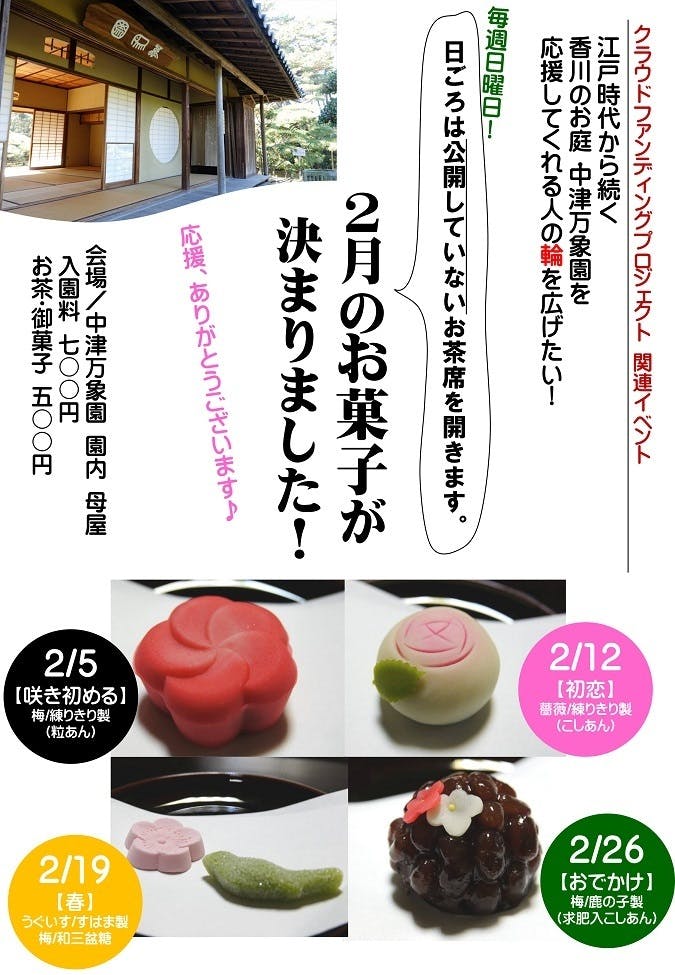 クラウドファンディング関連イベントとして、日頃は公開していないお茶室で、2月~4月の三ヶ月間、毎週日曜日においしいお菓子で皆さまをお迎えします(10-15時)