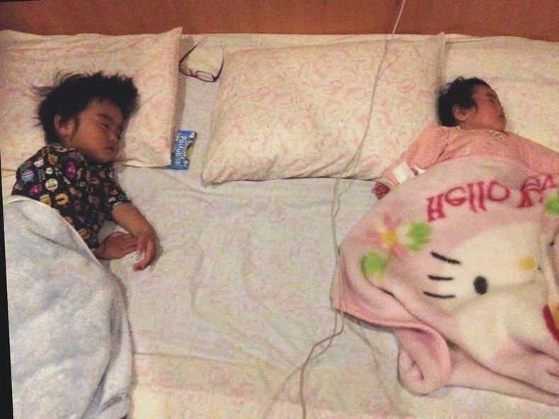 ↑長旅に疲れ、施設のお布団で安心して眠る子どもたち。