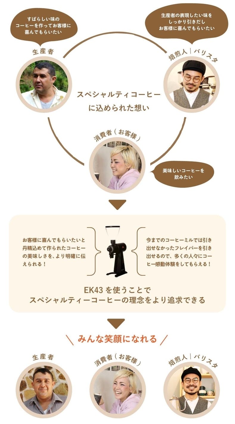生産者、生産に携わる全ての人、焙煎人、バリスタ、そしてコーヒーを飲む全ての人、みんなを笑顔にするコーヒーミルEK43!
