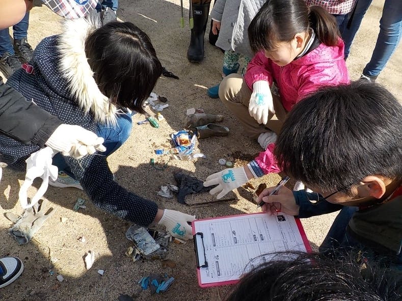 ごみを分類して、専用の「ごみ調査・データカード」に記入して数えていきます。このデータカードは「国際海岸クリーンアップ(International Coastal Cleanup)」にそっていて、秋のキャンペーン時には世界いっせいに同じやり方で調査をします。