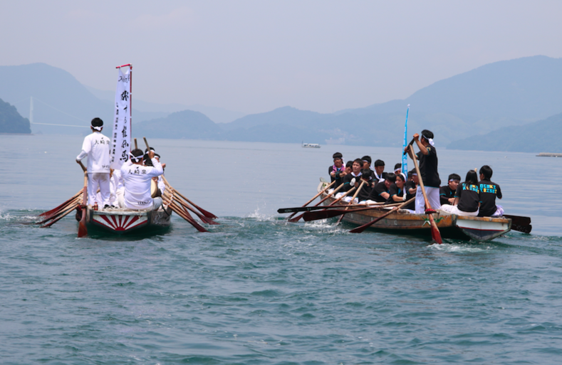 特に、到着地の宮島では2つの櫂伝馬が競漕を行います。