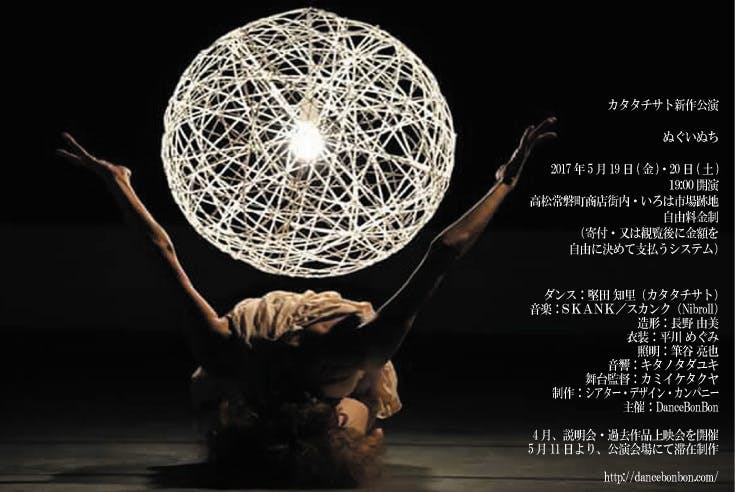 2017/05/22 00:38昨年夏の起案から、会場探し、遠距離ミーティング、滞在制作という長い期間を経て、作品創作。無事5月19日・20日には公演を行うことができましたことをまずここに感謝します。みなさまのご支援いただいたことにより、滞在制作は舞台・客席・照明・音響の機材の整った中、クリーションメンバー全員が実験・試行錯誤を重ねて日々更新しながら作品として形になってゆきました。この時間があったからこそ、強度のある作品としてお届けできたと思っています。ありがとうございます。今回のプロジェクトに掲げている「地元アーティストとともに新しいパフォーミングアーツを拡げたい」は、特にやはり滞在制作・公開稽古の時間を通して深める部分が大きかったです。 作品を提供する側のクリエーションメンバーはもとより、スタッフ、見に来る方たちも含めて。この試みを知って面白いと思った人が友だちに紹介したり、協力してくれたりして、本番を迎えることができ期待が膨らんでいっているのを感じました。立ち見満席で入場をお断りしてしまった方には本当に申しわけないですが、これからの課題とさせていただき、次への期待となっていただけると幸いです。カタタチサト、「ぬぐいぬち」メンバー一同、今回のクリエーションがまた次の波紋へと連なっていけると実感しています。「今、ここ」は「ここから」になりました。今後とも応援していただけますようどうぞよろしくお願いもうしあげます! もっと見る