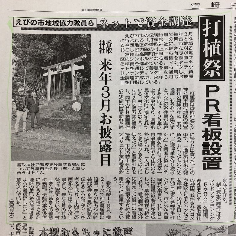 今日のえびの市は、曇り空のせいか昨日より過ごしやすい日となってます。 クラウドファンディングの方も明日までとなりました。 おかげさまで たくさんの方にご支援をいただき無事に看板を作成することとなりました。 本当にありがとうございます!! 目標も達成いたしましたので、感謝の気持ちを込めてお約束させていただきました 『今西 香取神社 打植祭 限定手ぬぐい』 を支援してくださった皆様に返礼品として追加させていただきます。 この手ぬぐいは 香取神社に代々伝わり、打植祭の行列には欠かせない行道面 境内にある樹齢400年の「なぎの大樹」のなぎの葉 打植祭の狂言に出てくる山車のウシ をモチーフとし、他の返礼品デザインと同じ えびの市出身在住の画家 入江万理子さんに、作成していただきました。 どうぞ、お楽しみに