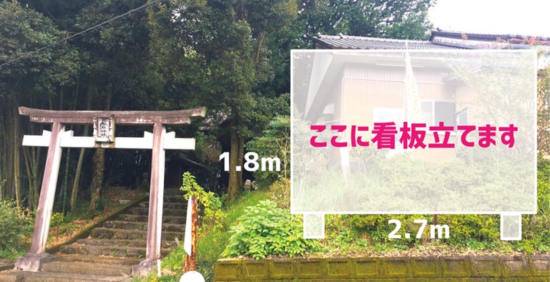 看板は幅2.7m×1.8mの大きさで、通り沿いからも目立つように香取神社の鳥居横に、設置します。当初は、えびの市出身在住の画家 入江万理子さんに描いていただいたものを印刷し、大きく伸ばし貼り付ける予定でした。しかし入江さんの提案により、看板に直接手書きで絵を描いていただくことになりました。