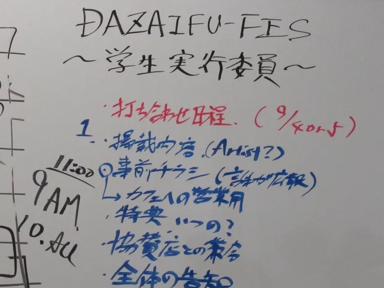 今回、学生の皆さんには『筑女「めざめ」プロジェクト』でご提案してもらったことをさらに広げて進展させてもらいたいと思い、DAZAIFU FES実行委員会よりいくつかの庶務の遂行をお願いしました。その庶務に対して、学生の皆さんが自主的に集まり、学生の皆さんだけで会議を開き、打ち合わせを行っていただきました。