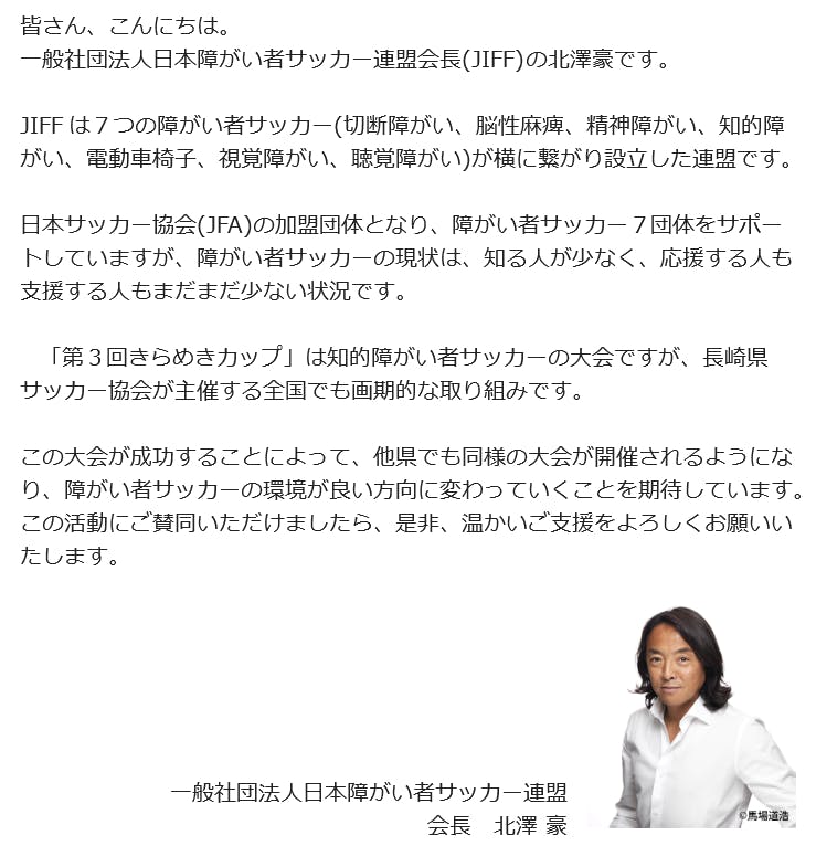 微力ではありますがそれぞれの地域社会で健常者との共有理解が深まることと確信しており、健常者と障がい者がともにサッカーを楽しむことができる社会を作り上げたいと思っております。
