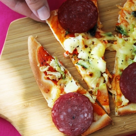 2.ピザ生地にピザソースを塗り、ドライベジ、チーズ、サラミ