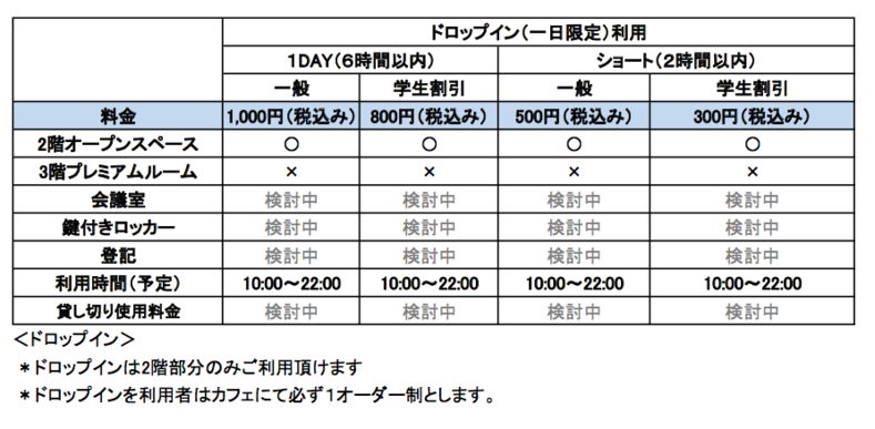 コワーキングスペースの月額利用料金です 会議室利用料やロッカー利用料などは これからの内装レベルにより変動しますので検討中としております ドロップイン(一日利用)の料金は下記の通りです 月額会員でもオープンスペースとプレミアムルームにより利用金額や利用条件も異なってきます オープンスペース限定会員、ドロップインは2階部分のオープンスペースのみご利用頂けます プレミアムルーム会員は2階オープンスペース、3階プレミアムルーム共にご利用頂けます 3階プレミアムルームはプレミアムルーム会員しかご利用できません 3階プレミアムルームは24時間ご利用頂けます 店舗の詳しい内容は5月19日のレポート「店舗詳細」をご覧ください。*上記利用料金はあくまでも予定案です 以下↓備品利用料