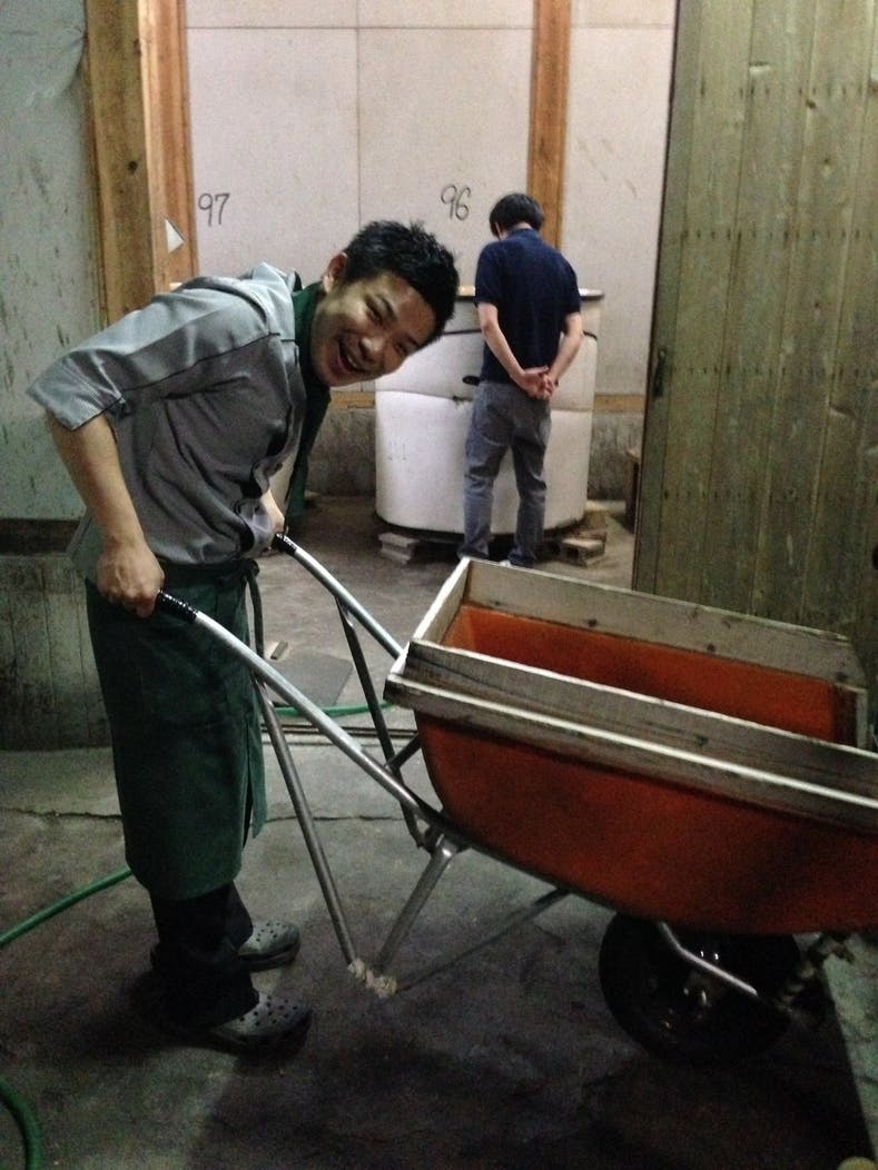 一輪車を持たせていただきました。カラの状態で持たせてもらいましたが原料が入ったら重いんだろうな~~