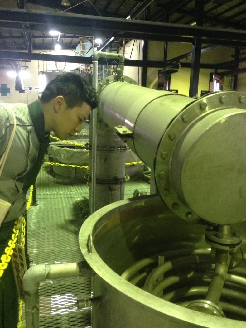 酒造王手門といえば、常圧・減圧を巧みに使い分け、素材本来の旨味を引き出すことへのこだわりが有名です。例えば、この写真は蒸留された焼酎が冷却される場所になります。銘柄によっては通常よりも冷却を強めに掛けることで、焼酎の風味を変えるそうです。蒸留機は焼酎作りの中でも重要な工程の設備になります。こんな内部まで見せて頂けるのは貴重です!!
