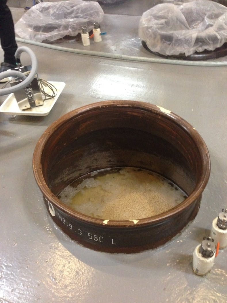 水と麹と酵母を和甕で一次仕込みの様子です。