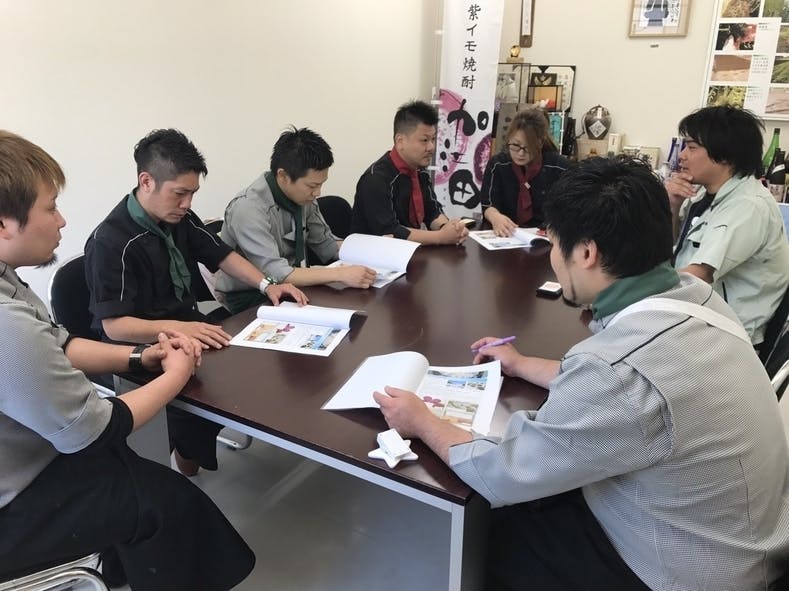 最初は座学です。基本的な焼酎の製造工程や、水・材料へのこだわりについてイラスト付きの冊子で丁寧に教えて頂きました。