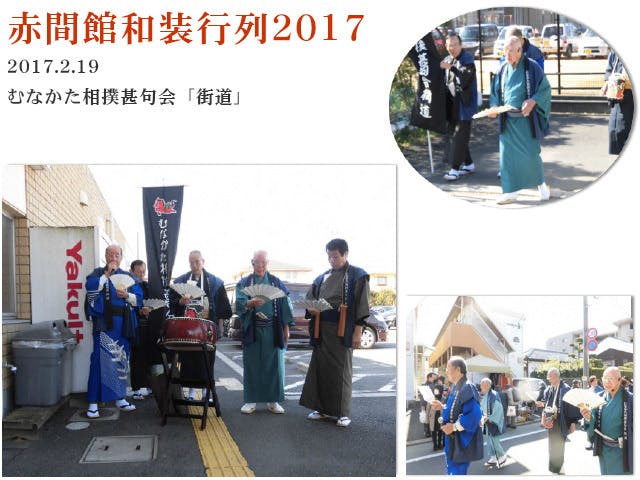 むなかた相撲甚句会「街道」は、平成27年4月19日「唐津街道」の赤馬館で7人の相撲甚句を愛好する仲間で結成しました。その後市民ボランティア担当者の知恵を借り、平成27年5月11日に市民活動の団体として登録を受け、ボランティアとして各イベント出演しています。