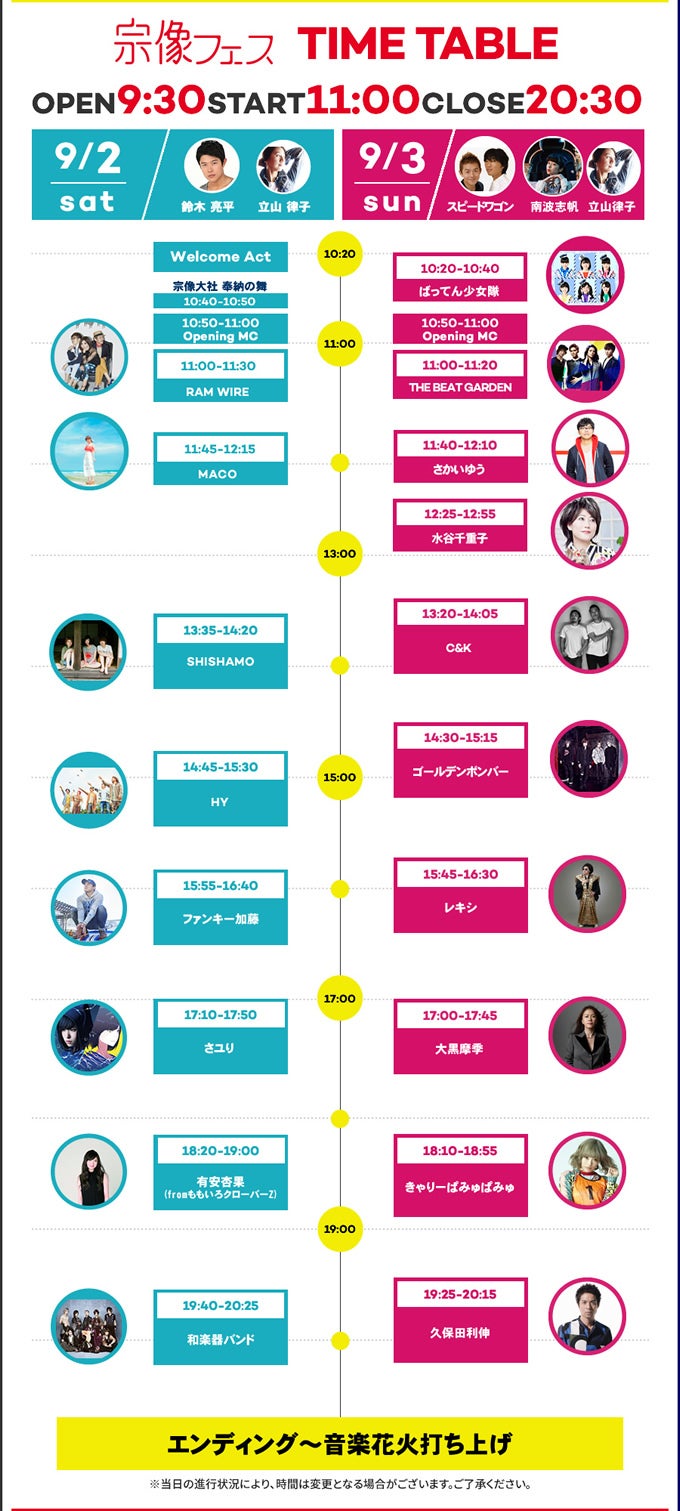 7月世界文化遺産登録決定した記念すべき今年は、著名なアーティストの方々による素晴らしい音楽、そして初開催となる地元食材をふんだんに使用した「宗像たべてん祭」そしてフィナーレを彩る「みあれ花火大会」と盛りだくさんの内容になっています。
