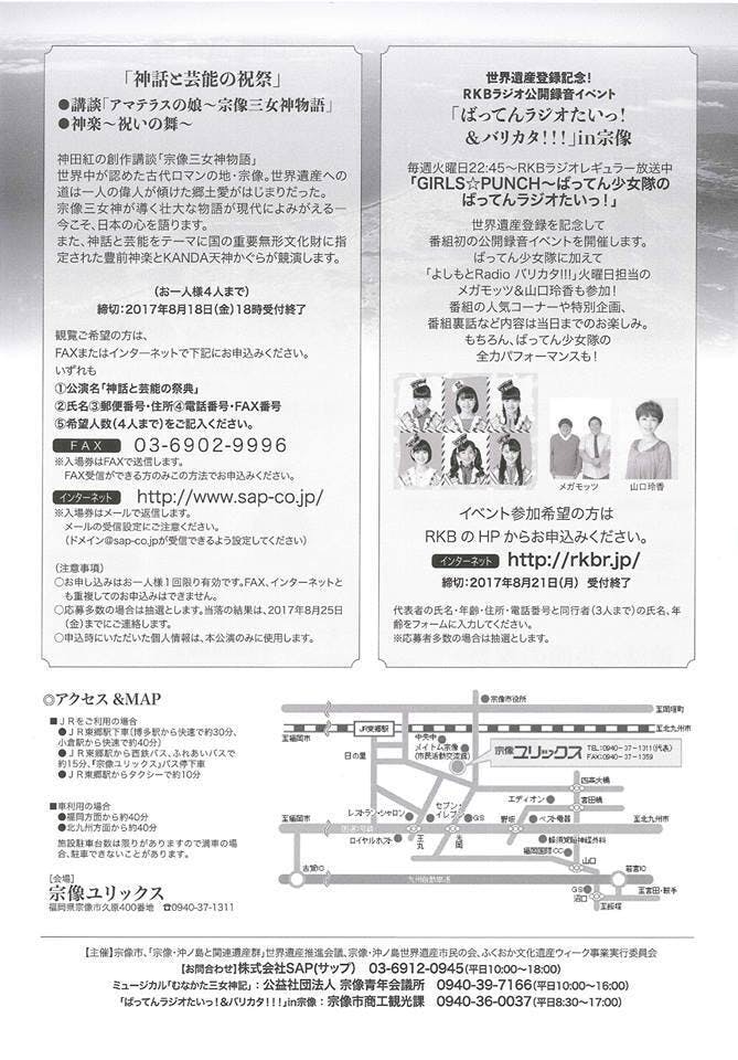 宗像にちなんだ講談と神楽、ミュージカル、ラジオの公開録音イベントです。講談・神楽、公開録音イベントは事前申込が必要ですのでお早めに!