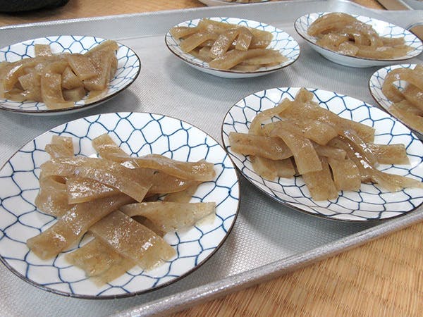 宗像の朝ごはんの定番おきゅうと。ごま醤油で食べます。型に流す前に濾さないことで歯ごたえのあるおきゅうとになります。また、短冊式に切ることも宗像の特徴です。