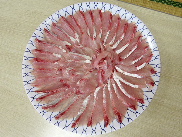 魚屋さんの経験をもつ吉田益美会長が、自ら大きなヒラマサを捌いていきます。あっという間に3枚に卸して、あっという間に薄切りに!こんなにキレイなお刺身の盛りが、本当にあっという間にできて、びっくりしました。ヒラマサ、漁協から直行してきただけあって新鮮で美味しかったですよ〜。