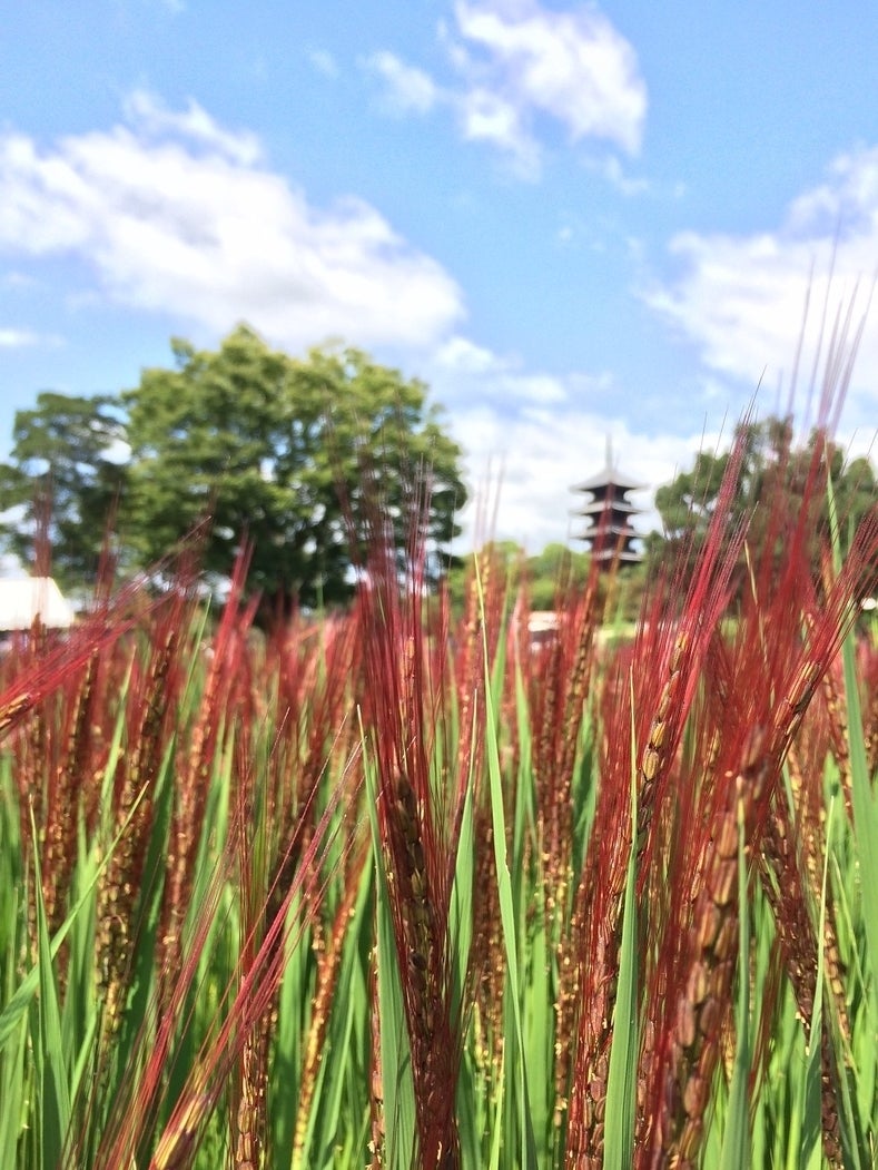 一方、私たちは、PRの為の『赤米』を耕作しています。こちらは総社市のシンボル的建造物 備中国分寺前に植えた赤米です。神事の赤米とは、品種が違い、穂の色合いも稲の長さも違います。