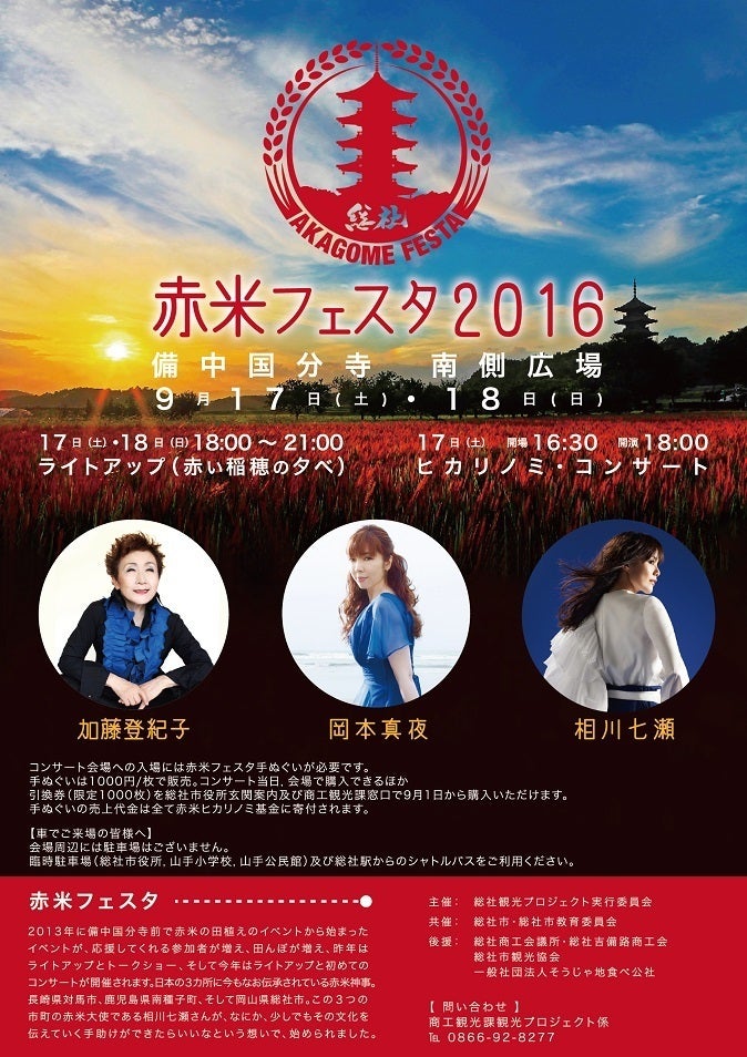 その中でも「赤米フェスタ」は歌手で総社赤米大使の相川七瀬さんを中心に、昨年第1回を開催しました。およそ3,000人の来場者とともに、オリジナル手ぬぐいを振り大いに盛り上がりました。