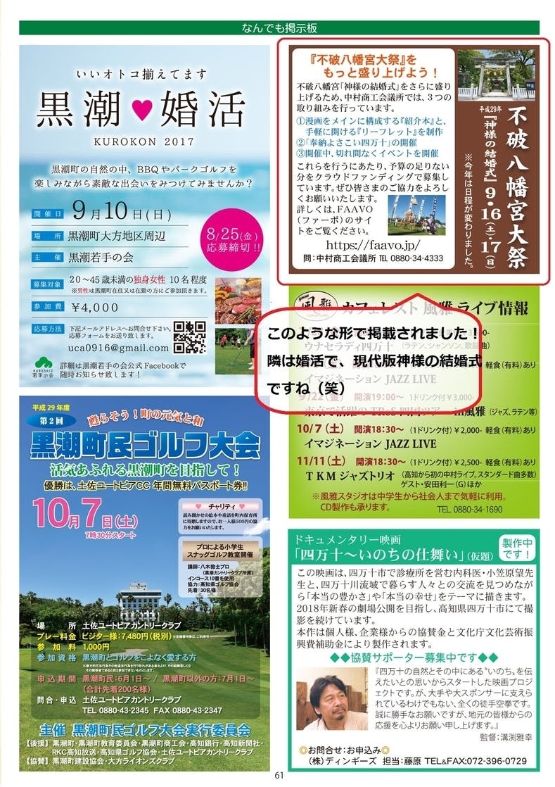 さて今日の投稿ですが、地元で人気フリーペーパー”はたも~ら”に取り上げていただきました。これは約3万部を幡多郡内のコンビニやガソリンスタンド、量販店、宿泊施設など約500ヶ所もに配布されていて、ここに掲載されている情報を参考に食事にいったり美容院にいったりするんですよ!