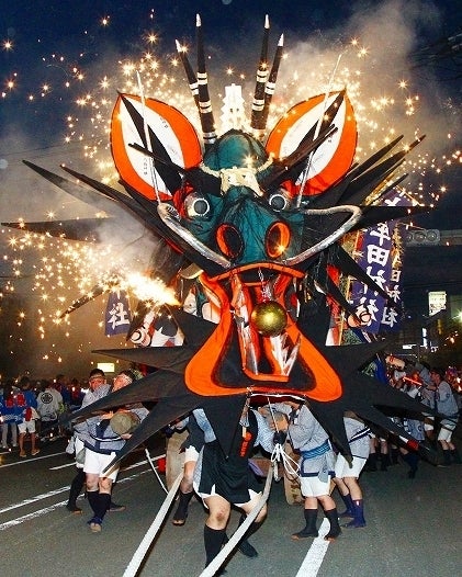 大蛇の頭の重量は各山で若干異なりますが、なんと約400kgもあります!その約400kgもある頭を左右に大きく振りながら、大きな口を開けて花火や煙幕を吐く姿の勇壮さは他には類を見ません。