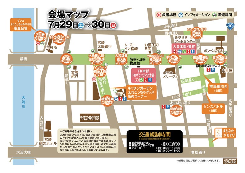 祭りの主な舞台は、宮崎の中心地橘通り。ステージを通り全体に散らばるように工夫し、大通りと交わる通りや公園にもイベントブースを設置、橘通り全体が盛り上がるように工夫をこらしています。