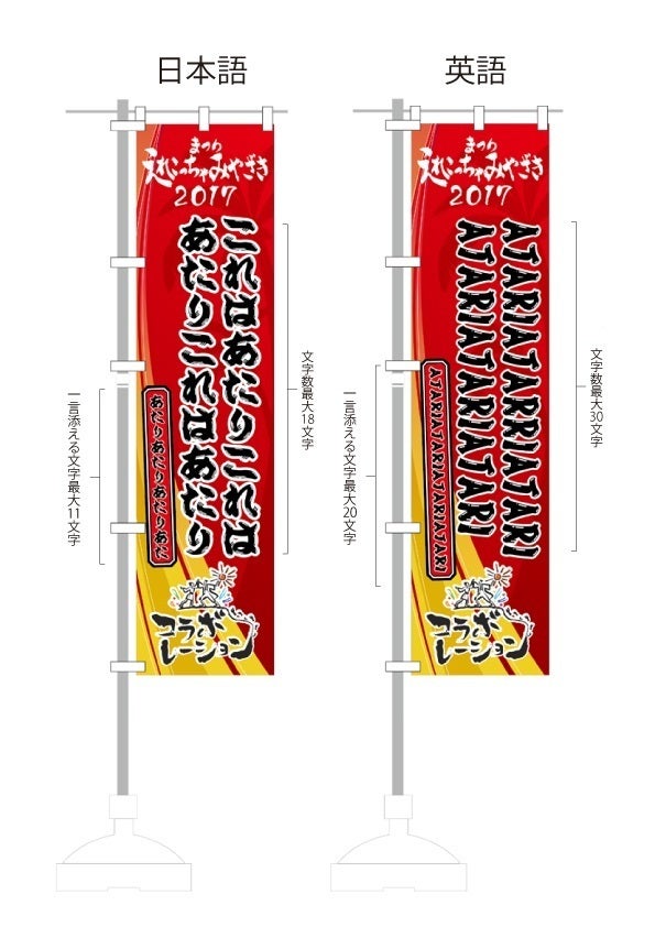 受付は個人のみ(企業での申し込みは不可)です。また、画像を参照し、のぼりに入れたい文言を18文字以内(英語の場合30文字)と11文字以内(英語の場合20文字)で備考欄に記載してください(画像をご参照ください)。