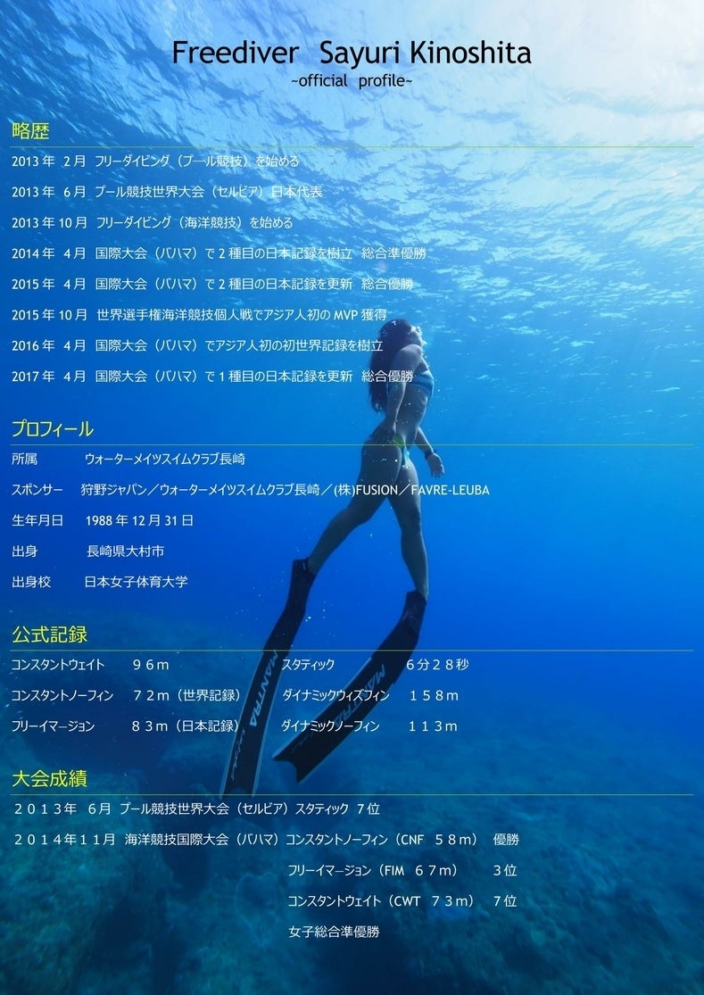 2017年8月22日より中米・ホンジュラスにて開催されるフリーダイビング世界選手権(2017 AIDA Depth World Championships)に、長崎県大村市出身の「木下紗佑里」が出場します。