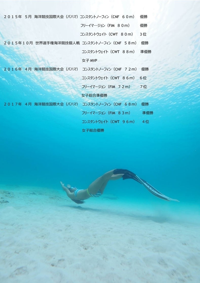 あれから2年がたち、2年前の大会では精一杯だった深度を今ではいつもの場所だと思えるようになりました。私もいろんな経験を積んで成長できたと思っていますが、世界のトップ選手たちのレベルも近年飛躍的に向上しています。今大会での私の目標は全種目で優勝、MVPを獲得し2連覇をすることです!もちろんいろんな条件を整えれば確実に達成すことができると確信しています。またどんな選手が頂点に立ってもおかしくない大会でもあります。私自身もどんな結果になるのだろうかとわくわくしています。たくさんの方に注目してもらえたらとても嬉しいです!大会で最高の経験ができるように楽しみながら全力を尽くしてきます!