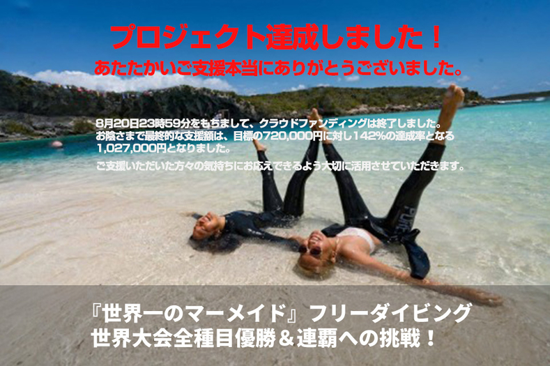 フリーダイビングという競技はまだまだ認知度が低く、優勝しても世界一になっても賞金もありません。練習環境が国内外の暖かい地域の海やプールということもあり、トレーニングや遠征、大会への参加にはかなりの費用がかかります。よって、私達は「木下紗佑里サポーターズクラブ」を発足すると共に、彼女の活躍を支援するため、活動費の調達を目的としてこのプロジェクトを起ち上げました。これにあたり、木下紗佑里の実姉であり一番の応援者である木下紗菜栄を代表に迎え入れました。