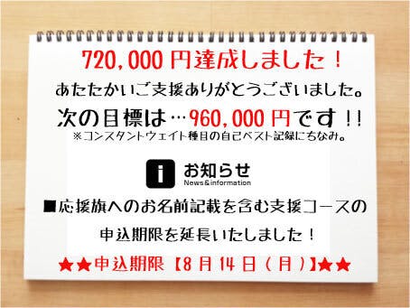 みなさまのあたたかいご支援のおかげで、目標の72万円を達成しました!ご支援いただいたみなさま、いいねやシェアで応援していただいたみなさま、本当にありがとうございました。 第2目標を96万円とし、引き続きチャレンジを続けます。いただいたご支援で、滞在費の不足分、トレーニング費、プレ大会参加費を補いたいと思います。 また、応援旗へのお名前記載を含むリターン品の申込受付を、【8月14日(月)】まで延期いたします 残りの期間は短いですが、全力で取り組んでまいりますので、みなさま引き続きよろしくお願いいたします。