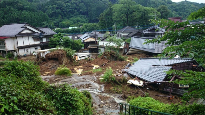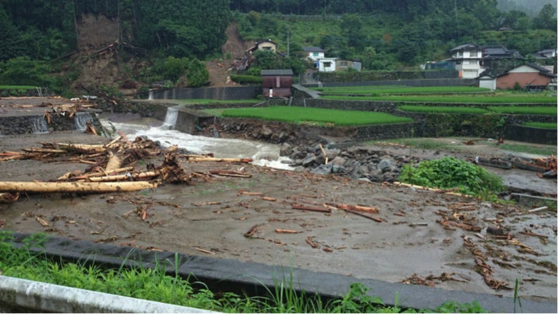 ▲その東峰村が、7月5日に発生した大水害で、壊滅的な打撃を受けてしまいました。のどかな田園風景が広がる宝珠山地区では、山は崩れ、田んぼは埋まり、家は押し流されてしまいました。