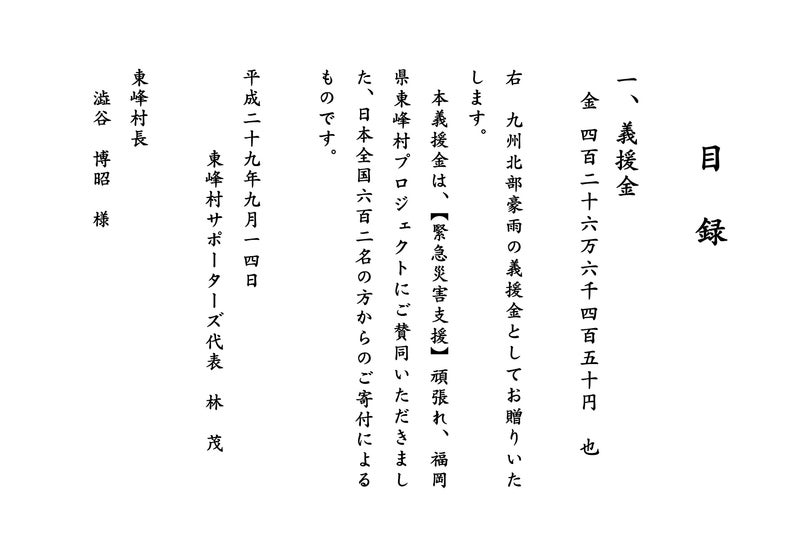 2017/09/16 09:44東峰村サポーターズ代表の林です。 先日、9月14日に東峰村役場を訪問し、澁谷村長に皆様からいただきました義援金を贈呈してまいりました。 目録は以下の通りです。 澁谷村長からは、日本全国から602名もの方々が、東峰村を思ってご寄付を頂いた事への感謝と、感動のお言葉をいただきました。澁谷村長からのお礼の言葉につきましては、別途、メールにて皆様にお送りさせていただきます。 東峰村からの受領証は、以下の通りとなっております。 皆様からいただきました義援金につきましては、東峰村義援金配分割合決定委員会での審査の上、被災状況に応じて、被災した東峰村民の方々に送られる事になります。 澁谷村長からは、東峰村の今回の豪雨の被災状況と、今後の復興についての計画をご説明いただきました。 澁谷村長は、村長就任以前は、私と同じ建設・土木関係の仕事に携わっておられ、その経験を活かした、災害復興工事のビジョンをお聞かせいただきました。 今回の豪雨では、5年前の平成24年豪雨の際に壊れ、修復した護岸がまた壊れたと言う事象が多発しており、もはや従来の基準での復興工事では村民の方を護れない事、今回のような豪雨が再び起こる事を想定した対策が必要である事を力説されておられました。 以上、贈呈式の模様をご報告させていただきます。 ご寄付をいただきました皆様、本当にありがとうございます! もっと見る募金先の決定と、贈呈式のご案内