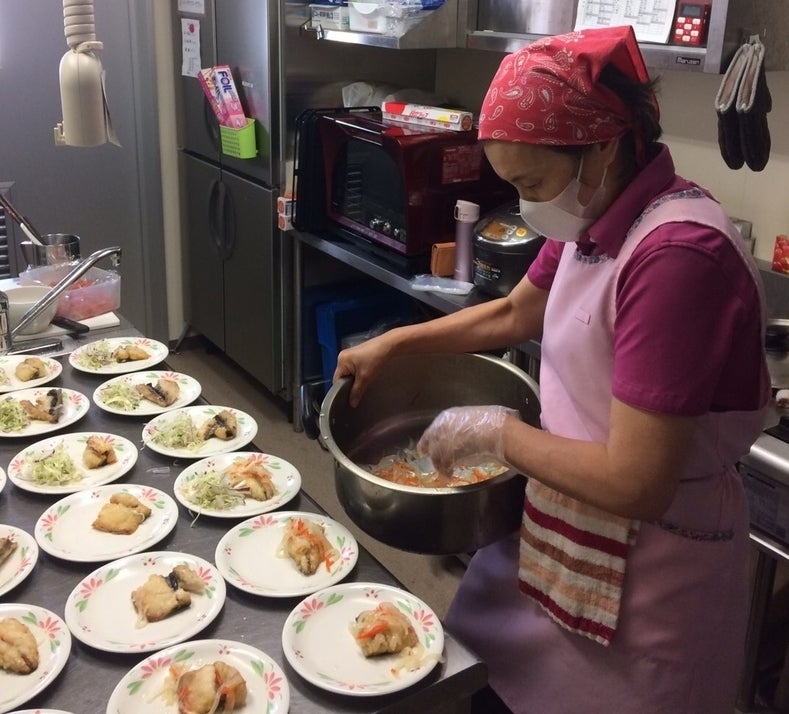 ▲メインで調理を担当するのは小田さん。甘木の介護施設でおいしいごはんを作るスペシャリストです。「いろんな施設いったけど、ここのが一番!」100歳のおばあちゃんからもお墨付き!