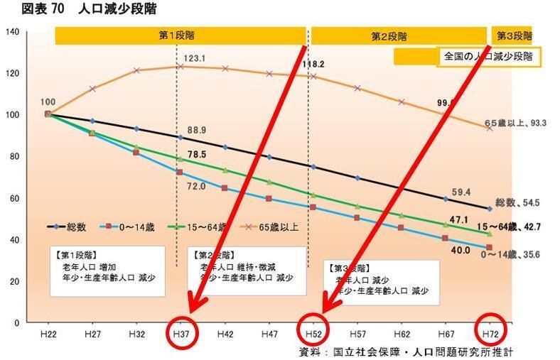 長崎市によると、グラフのとおり、人口減少と高齢化の進行状況を計る人口減少段階が全国に比べ、長崎市は15年から20年早く、全国よりも先行して人口減少と高齢化が進むと予想しています。