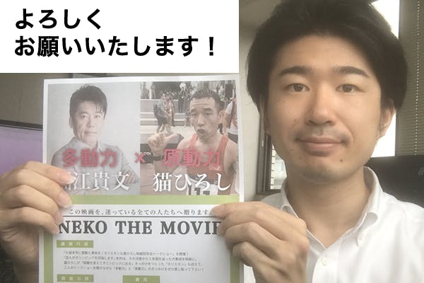 今回、ホリエモンの「多動力」の一つ、また猫ひろしの「原動力」から繋がった劇場用ドキュメンタリー映画「NEKO THE MOVIE」を上映させたく、このプロジェクトを立ち上げました。