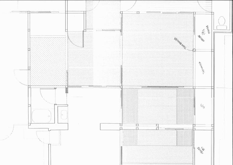 こちらが、2人で起こした平面図、上記でも紹介しました専門家松浦さんを交えて、木造在来工法建築の各、名称から覚えていきます。