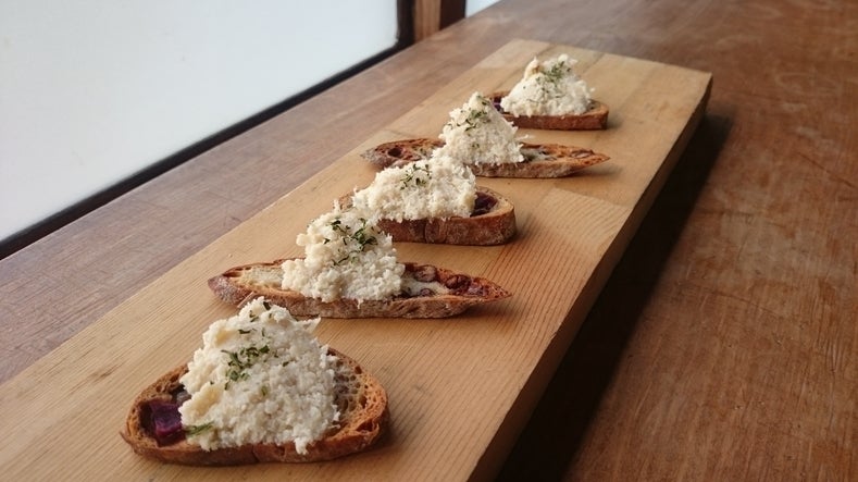 おから(津山市加茂町の豆吉豆腐さんのもの)を野菜のコンソメで炊き戻し阿波のガーリックで香り付けしました。バケットに乗せ、ディップとしてパーティーのサイドディッシュに。あるいはステーキの付け合わせなどにいかがでしょうか?。何かもう一品欲しい時に重宝しますよ。